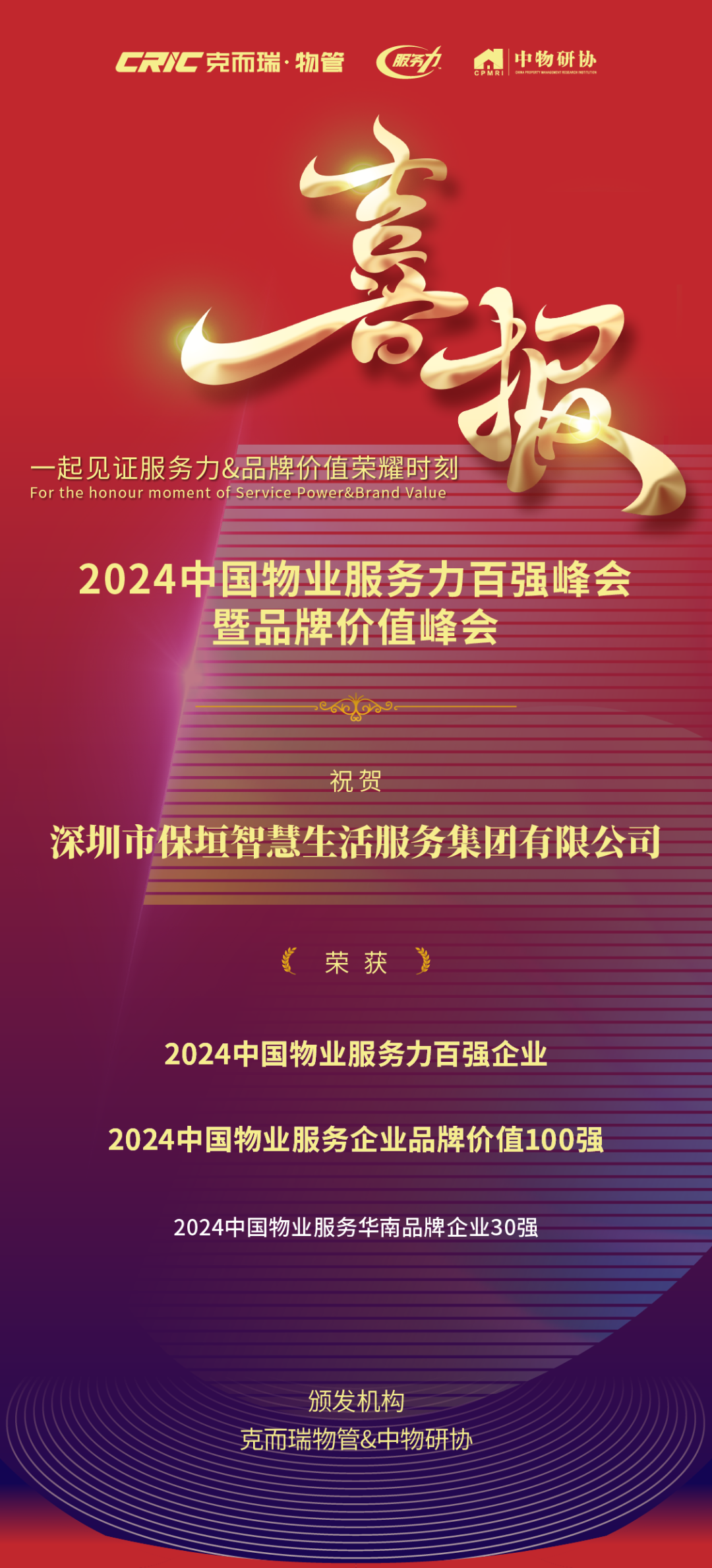 喜报丨保垣智慧生活荣获“2024中国物业服务力百强企业”等奖项